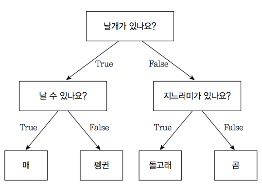 - 맨 마지막에 매, 펭귄, 돌고래, 곰은 터미널 노드(Terminal Node) 혹은 리프 노드(Leaf Node) 라고 합니다